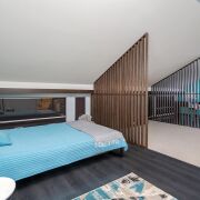 Всего в доме представлено 5 комнат: гостиная с обеденной зоной и кухней, мастер-спальня с гардеробной и просторным санузлом, рабочий кабинет, детская и мансардный этаж (72 м2) с санузлом, спальней, кабинетом и зоной отдыха.