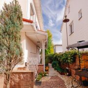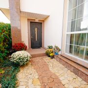 4 сотки в частной собственности; оформлен с учетом современных дизайнерских решений: здесь есть небольшой палисадник с японским сухим ручьем, лужайка с виноградником, патио зона со вход в СПА-зону в доме. Особый колорит двору придают дорожки из рваного натурального камня (болгарский сланец).