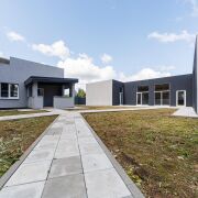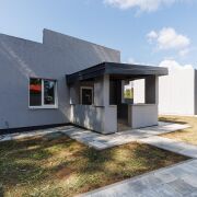 - Построен из газосиликатных блоков 30 см, утеплёние 5 см, выполнена внешняя отделка декоративной штукатуркой. Фундамент свайно-ленточный, пол – бетон.
