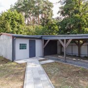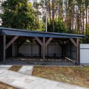 - На участке, кроме жилого дома, имеется гостевой дом с баней, вместительная мастерская, гараж с навесом на 2 автомобильных места. Участок огорожен забором из металлопрофиля. Предусмотрены въездные распашные ворота.