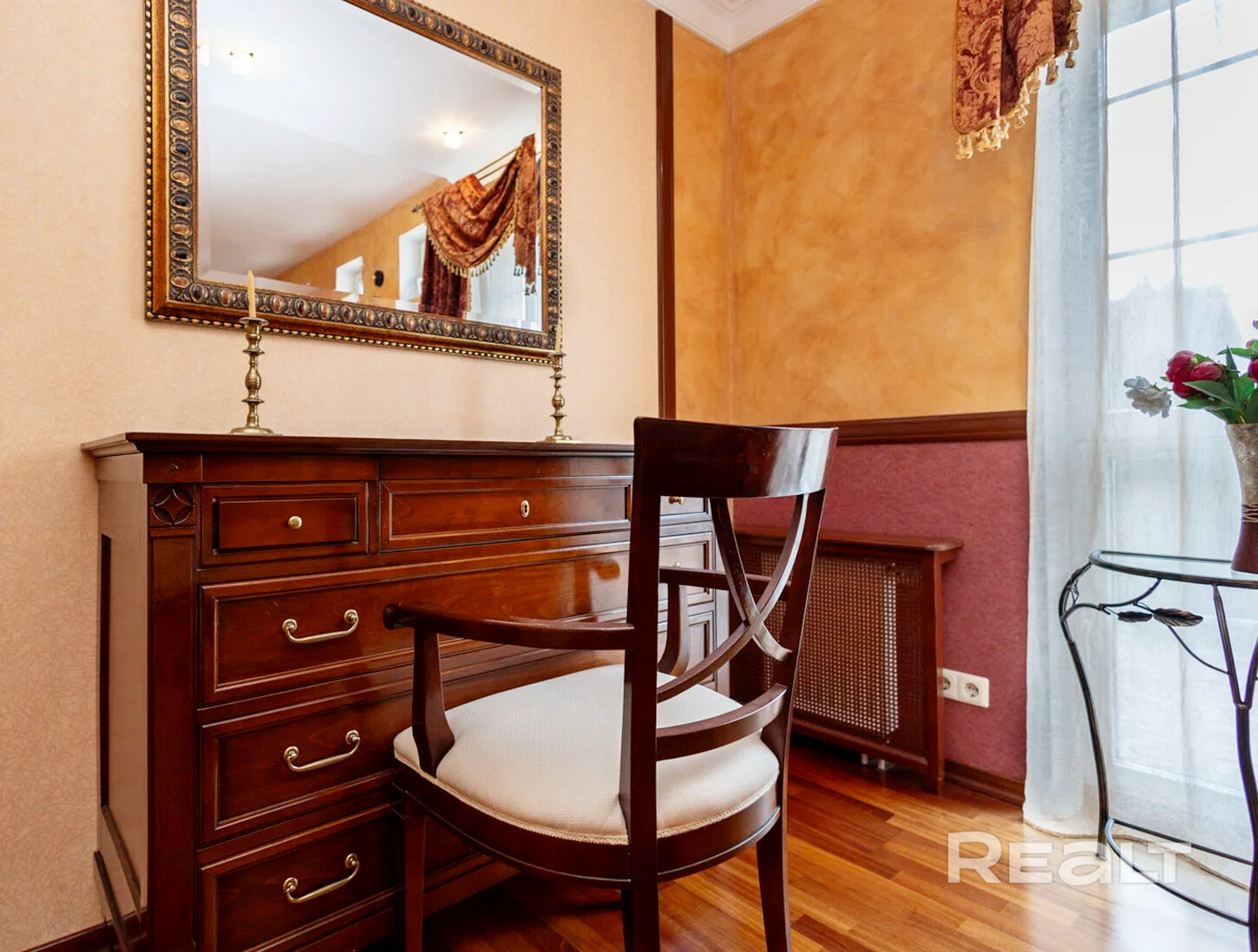 Стены оформлены декоративной штукатуркой и рисовой бумагой с воском.