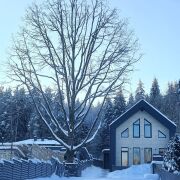 Коттедж введён в эксплуатацию в 2025 году, в нём никто не проживал. Кухня-гостиная с панорамным остеклением и видом на водоём — ключевая особенность объекта. Участок граничит с лесным массивом, что обеспечивает тишину и уединение.