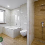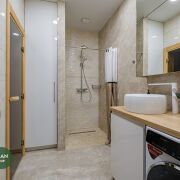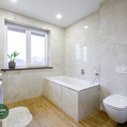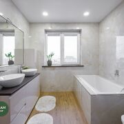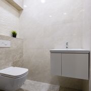 Керамогранит, тёплые полы, качественный пол, дорогая сантехника, стильная мебель — интерьер выглядит современно, свежо и дорого.