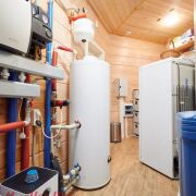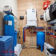 -Современная топочная с погодозависимой автоматикой, насосные группы, радиаторы, водяные тёплые полы, бойлер, стабилизатор напряжения 380, датчики управления температурой, химводоподготовка;