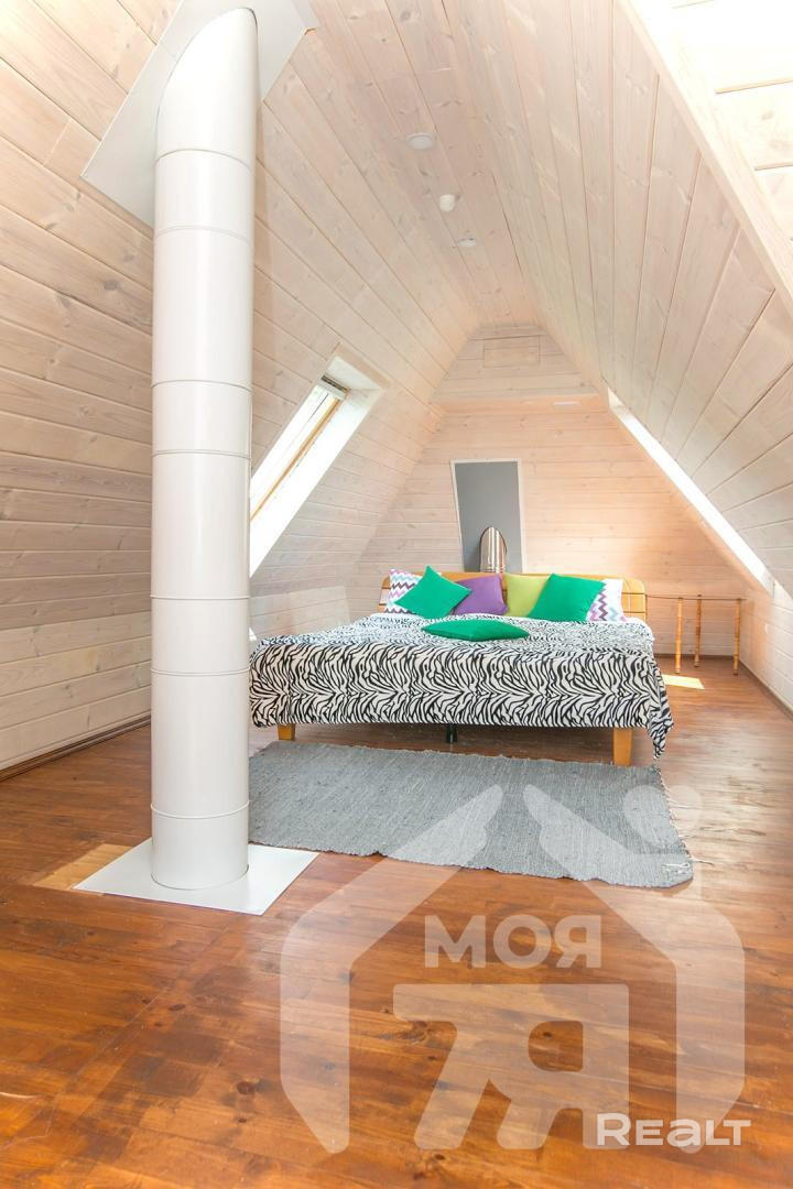 -Спальная комната на мансардном этаже площадью 27 кв.м. - это чистое и светлое пространство для отдыха. Мансардные окна «Велюкс» создают солнечную атмосферу и открывают потрясающий вид на ночное небо.