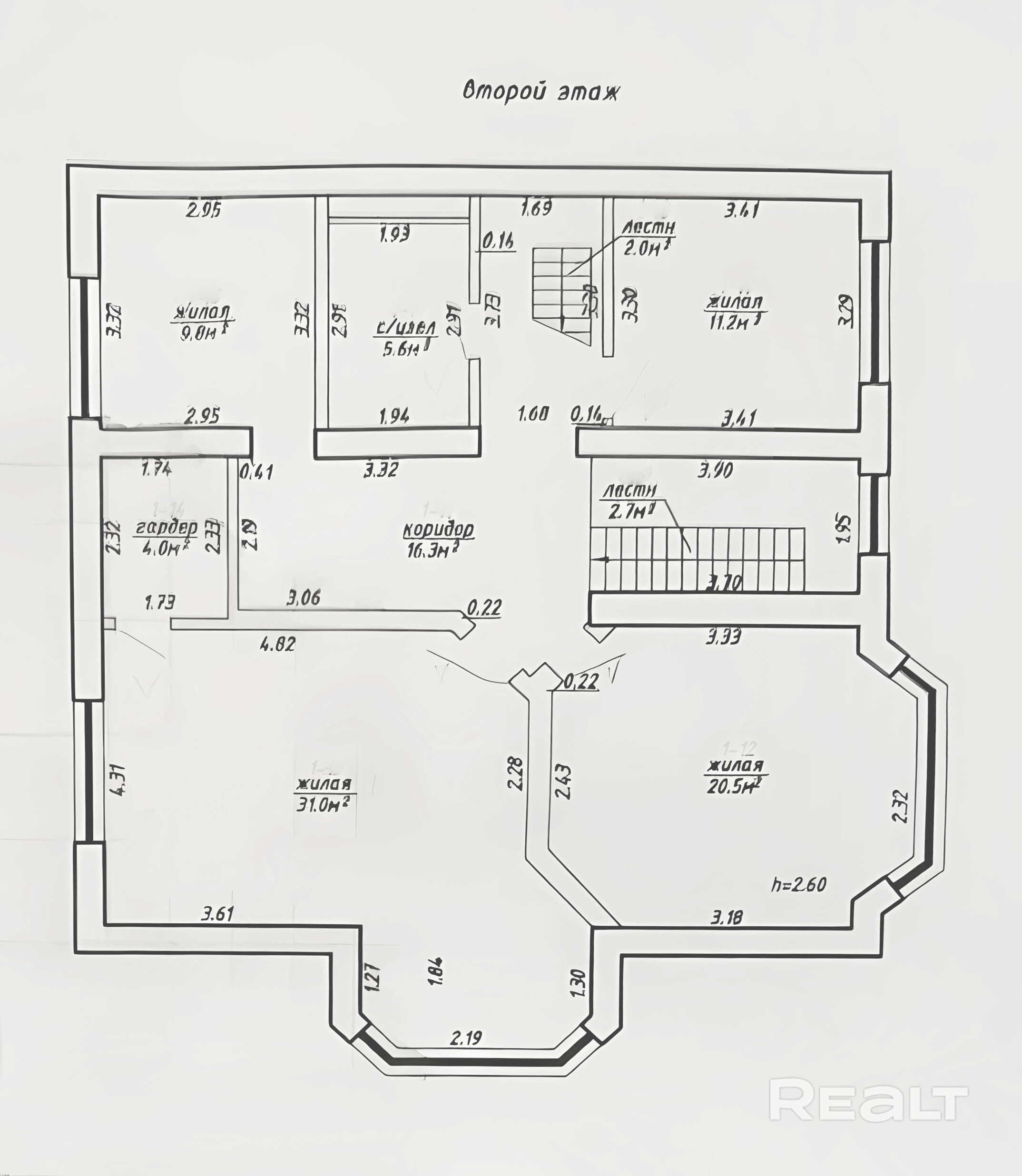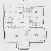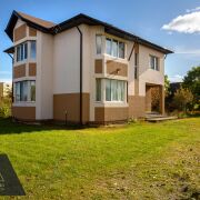 Общие размеры по осям 11,5 х 11,5 м, построен из пенобетона с утеплением и декоративной штукатуркой