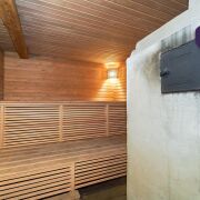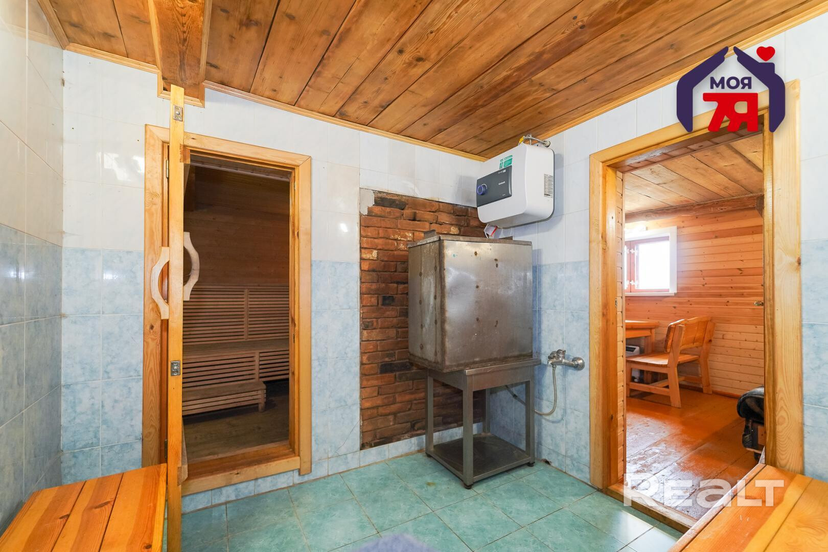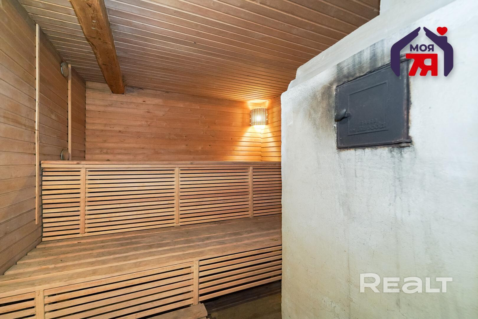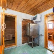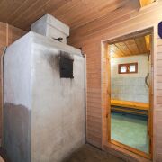 3. Баня с хозяйственным блоком из кирпича под единой кровлей из шифера. Электрифицирована, проведен водопровод от собственной скважины. Баня (6.1м * 6.2м) имеет несколько отделений: предбанник (1.6м * 2.9м), комната отдыха (3.8м * 2.8м), благоустроенная и оснащенная необходимой мебелью, моечное отделение с теплым полом и емкостью для горячей воды, парильное отделение, рассчитанное на 2-4 человека одновременно. Печь из кирпича обеспечивает необходимую температуру через два часа после начала топки.