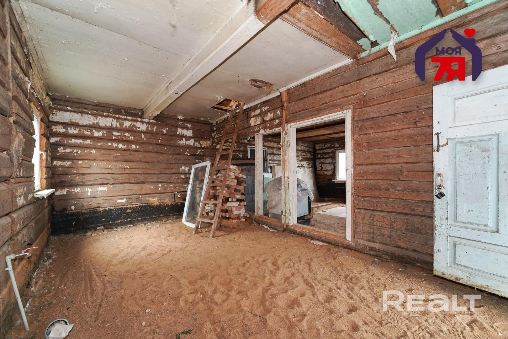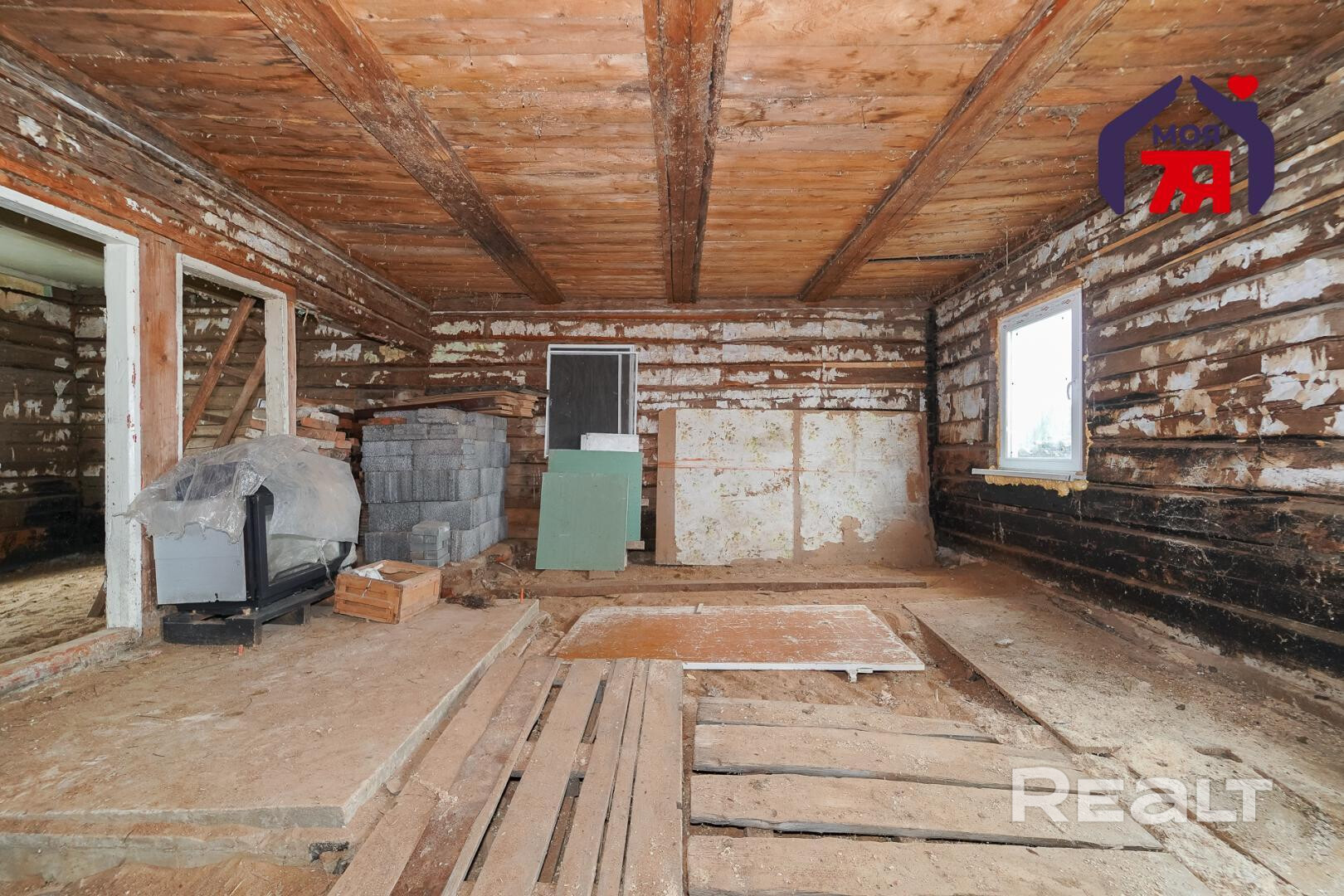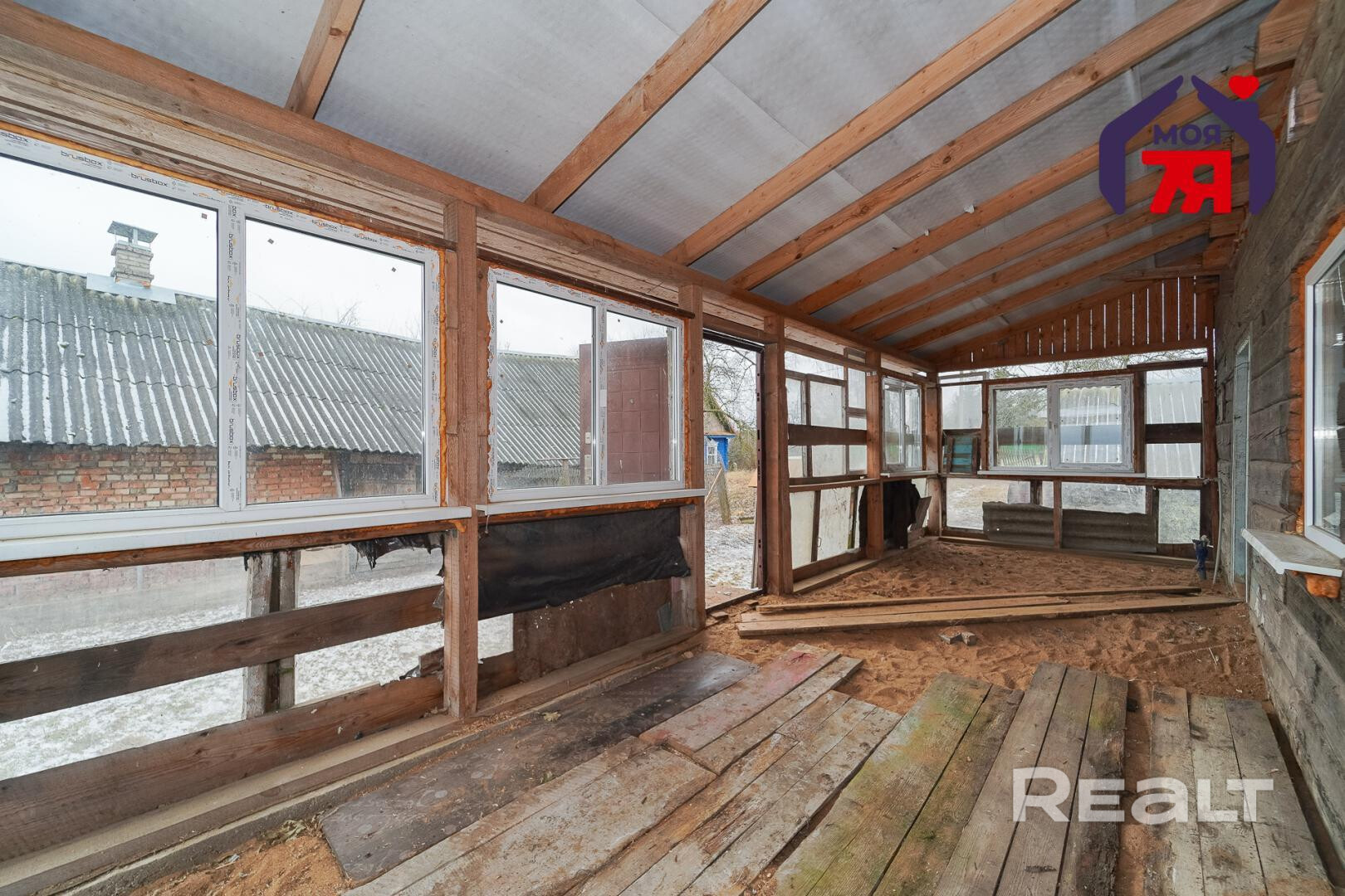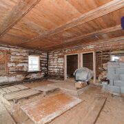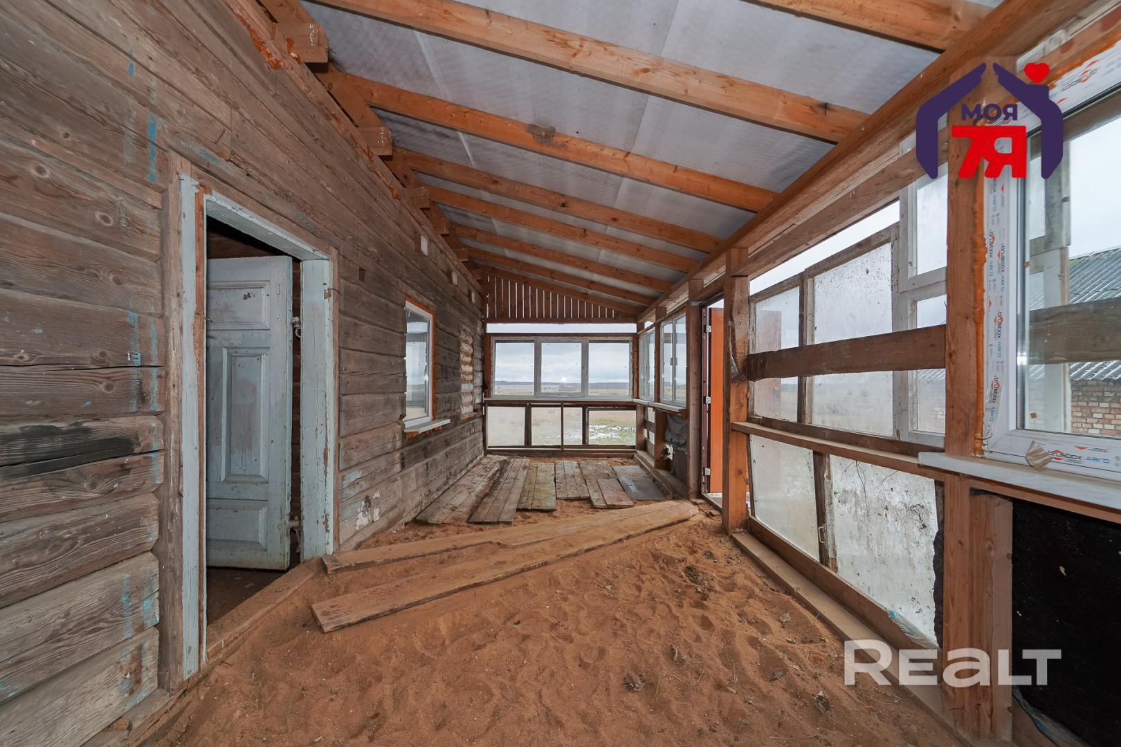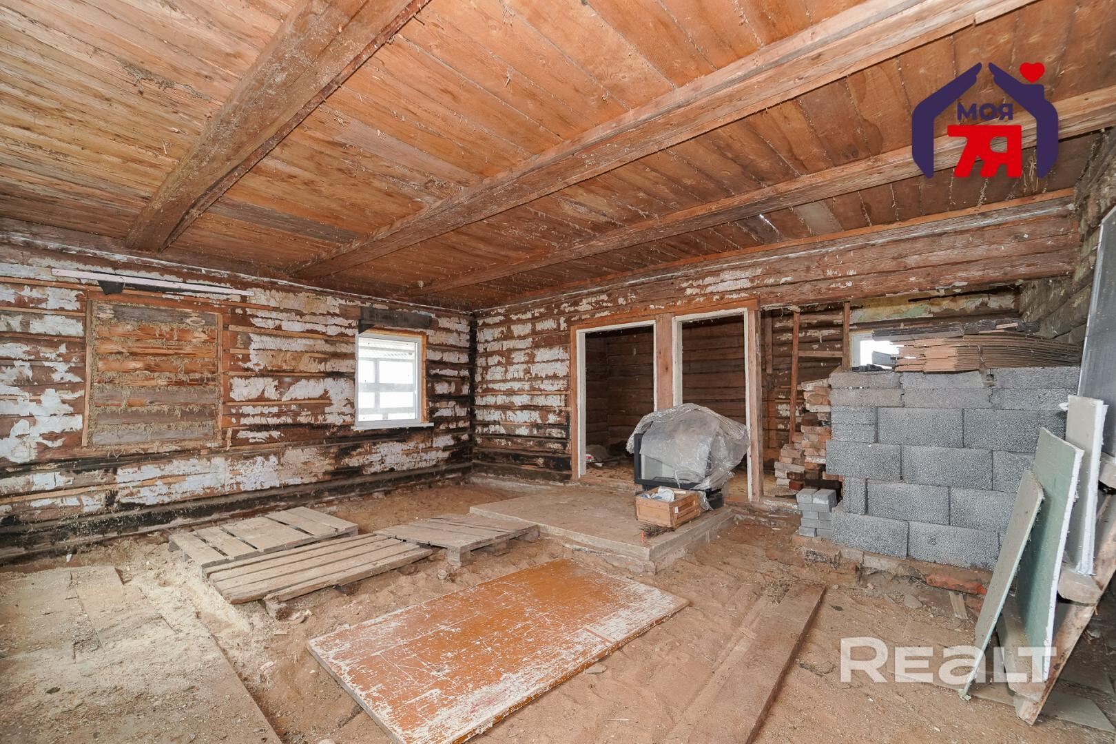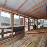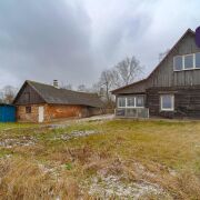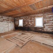 1. Бревенчатый дом площадью 54.3 кв.м. (8.6м * 6.3м). К нему подведены водопровод от собственной скважины (глубина - 50м), электричество, местная канализация с двумя переливными колодцами, оптоволокно для интернета от Белтелеком. Крыша полностью изменена, создан высокий чердак, который можно переоборудовать в жилую мансарду. К дому пристроена веранда площадью 25 кв.м. (8.6м * 2.9м). Установлены двухкамерные окна из ПВХ, общая кровля покрыта ондулином. После демонтажа старой внутрянки работы по облагораживанию дома не выполнялись, за исключением земляных работ, монтажа водопровода и канализации.