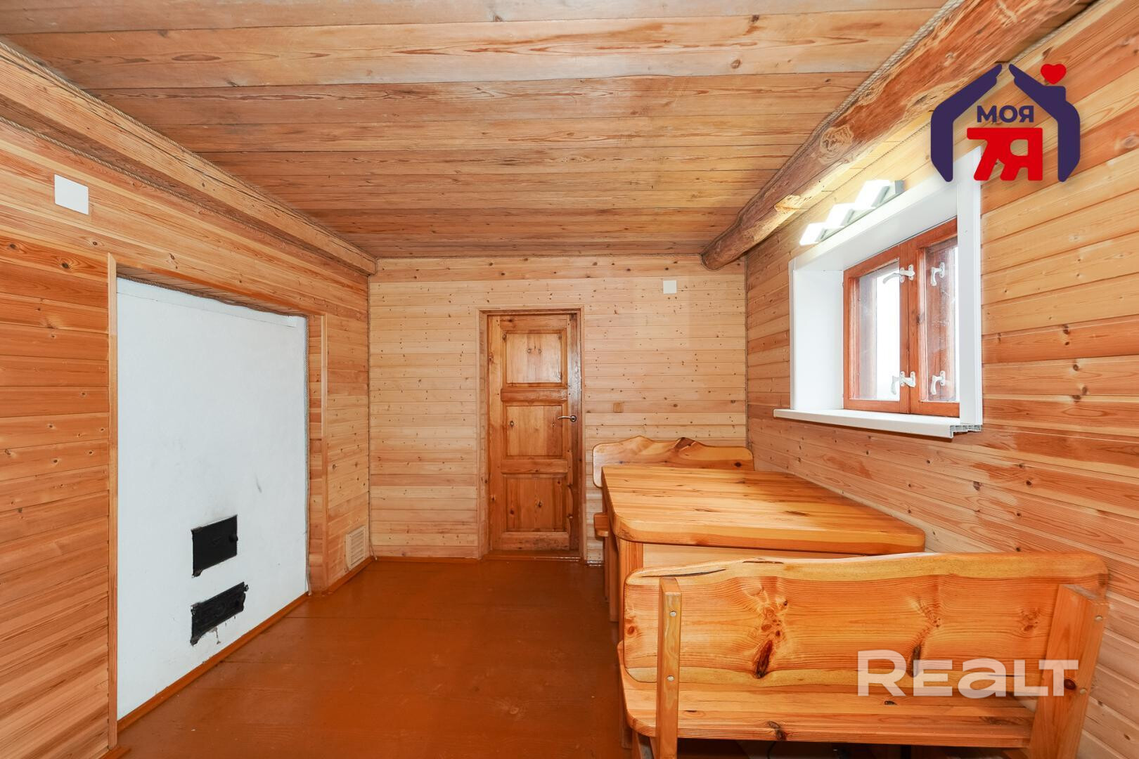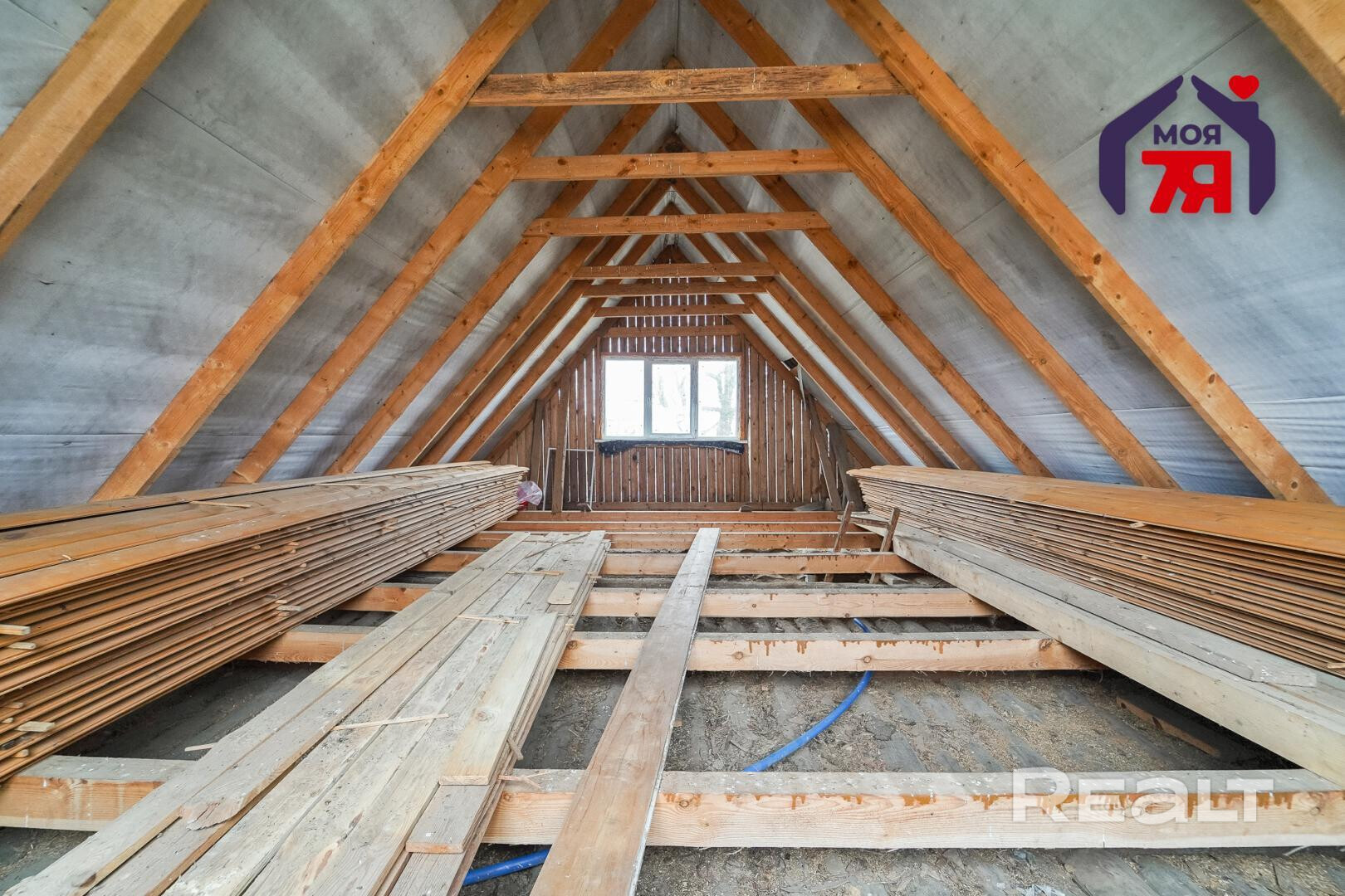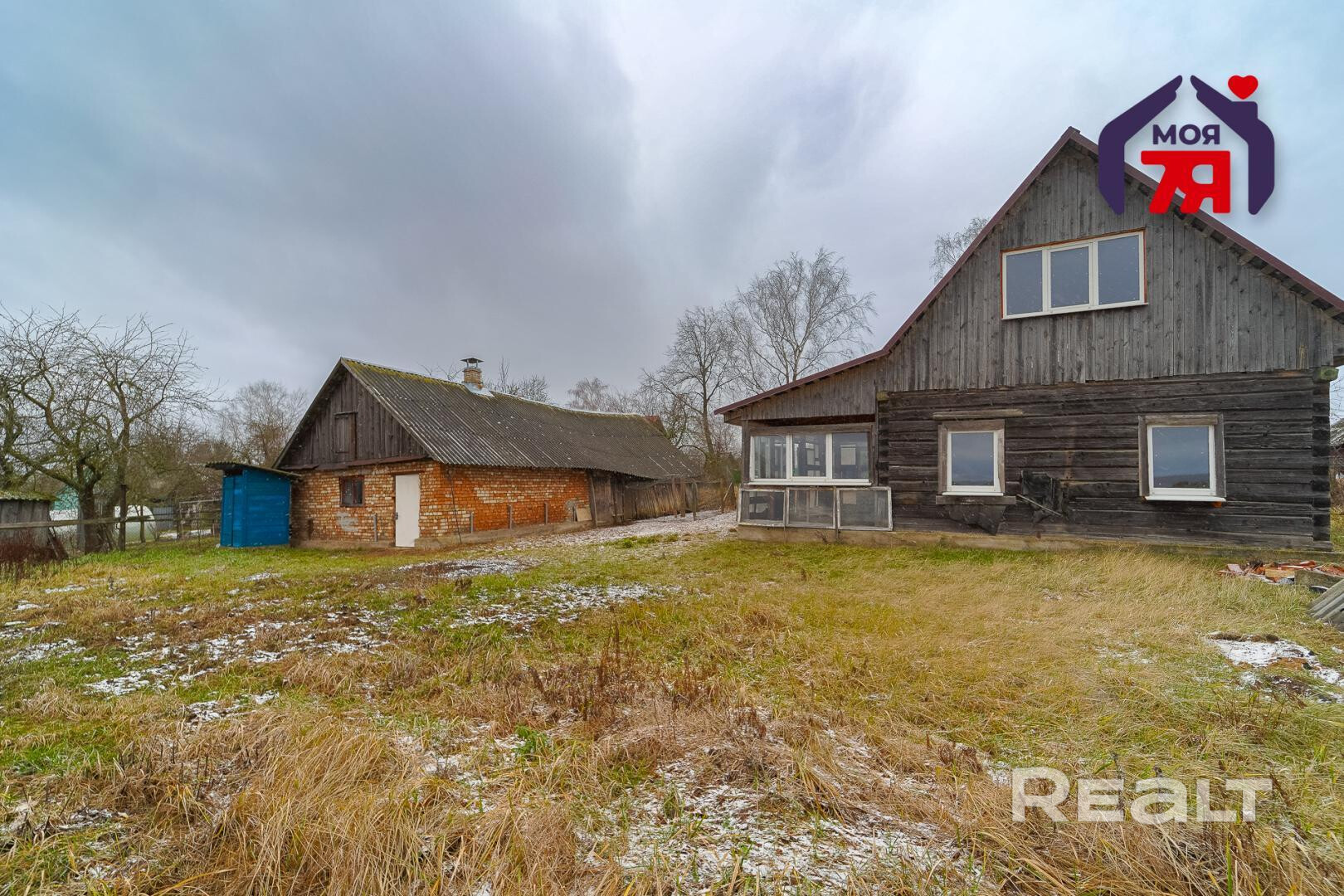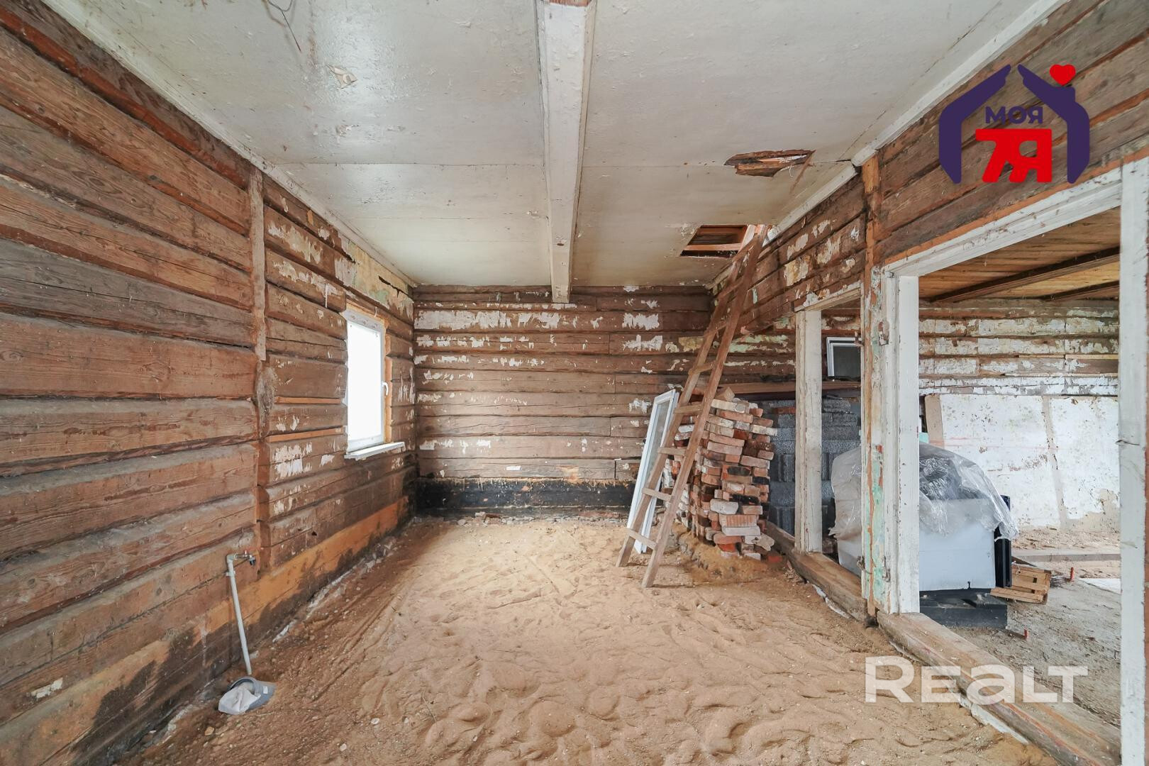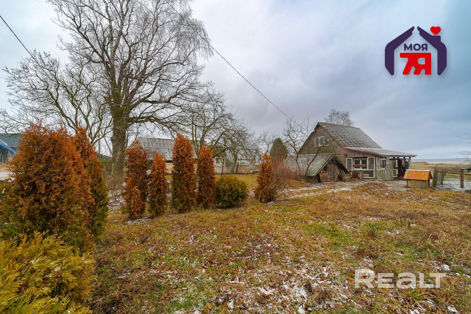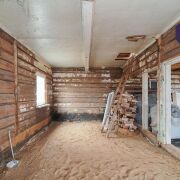 1. Бревенчатый дом площадью 54.3 кв.м. (8.6м * 6.3м). К нему подведены водопровод от собственной скважины (глубина - 50м), электричество, местная канализация с двумя переливными колодцами, оптоволокно для интернета от Белтелеком. Крыша полностью изменена, создан высокий чердак, который можно переоборудовать в жилую мансарду. К дому пристроена веранда площадью 25 кв.м. (8.6м * 2.9м). Установлены двухкамерные окна из ПВХ, общая кровля покрыта ондулином. После демонтажа старой внутрянки работы по облагораживанию дома не выполнялись, за исключением земляных работ, монтажа водопровода и канализации.