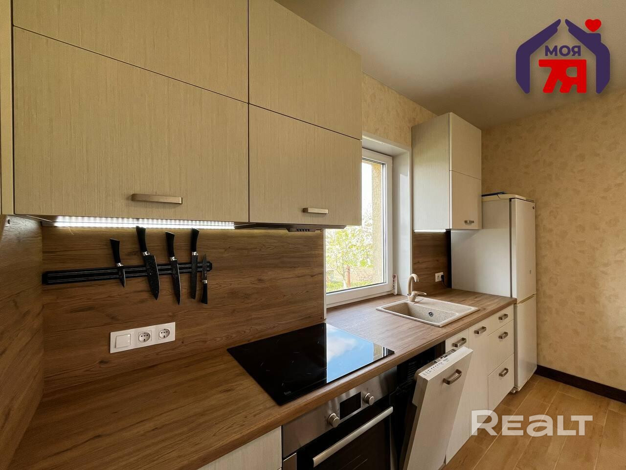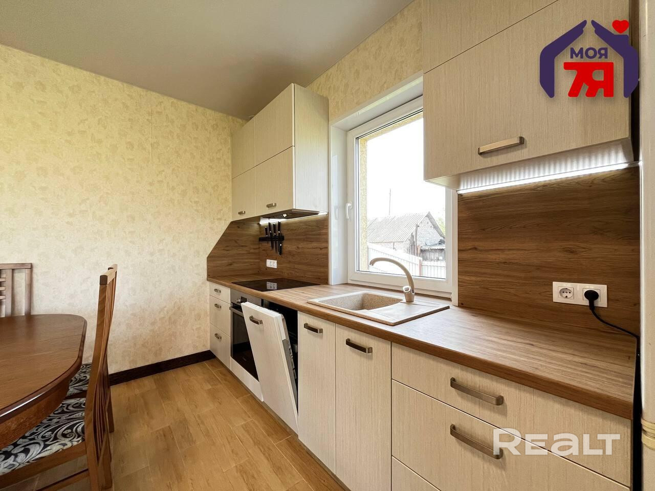 - Кухня - одна из главных жемчужин: стильный гарнитур, варочная панель, духовой шкаф, посудомоечная машина и даже встроенная система для хранения с современными направляющими - все это предусмотрено для удобства и красоты. Поверхности легко очищаются, освещение функционально.