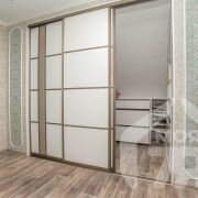 - На первом уровне уложена плитка с системой подогрева пола. На втором используется ламинат что создаёт единый ритм покрытия по всей площади.