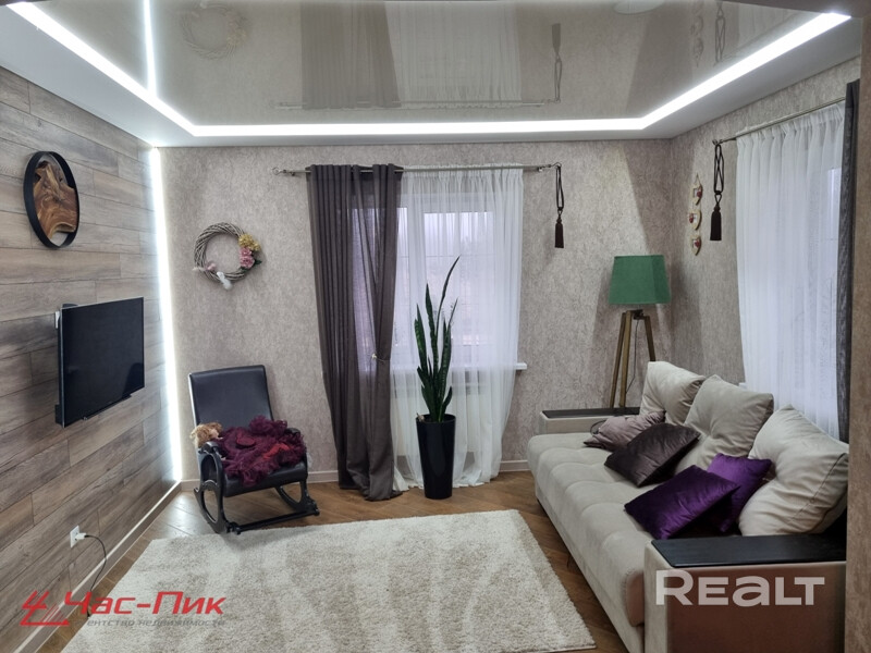 Одноуровневый дом 2021 года постройки, возведен из газосиликатных блоков и оштукатурен. Крыша - гибкая черепица. Система отопления включает в себя электроотопление, печь и камин. К дому примыкает открытая терраса, идеальная для отдыха и наслаждения свежим воздухом.