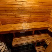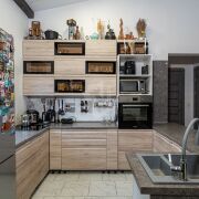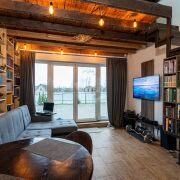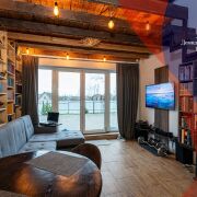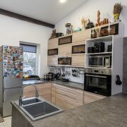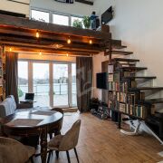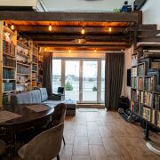 - Планировка и интерьер: открытая кухня‑гостиная с кухонным островом и столовой зоной, комфортный диванный угол, рабочая зона у окна. Высокие деревянные балки и тёплый декоративный потолок создают уютный лофт‑шарм; большие панорамные двери ведут на просторную террасу. В доме продуманы места для хранения — высокие полки и книжные стеллажи по стенам, есть место под домашний кабинет
