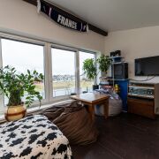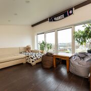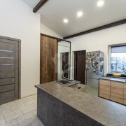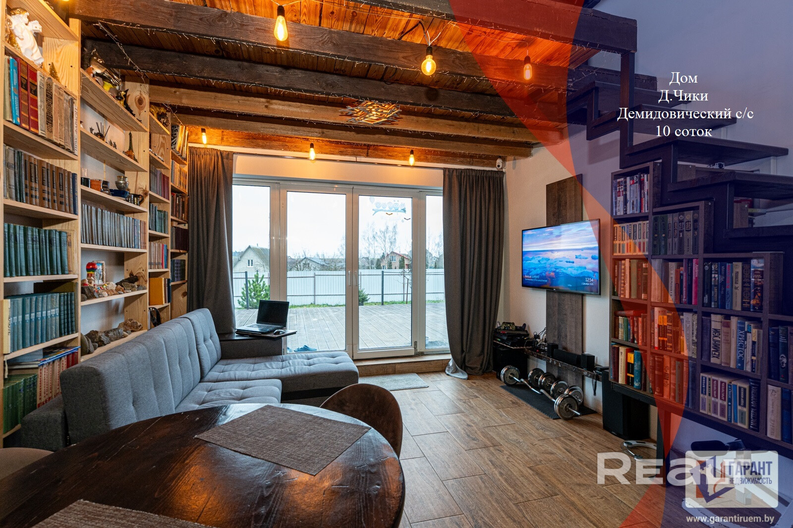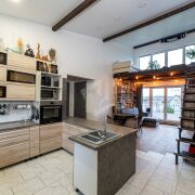 - Продаётся открытый двухуровневый дом с большой террасой и огороженным участком. Светлая гостиная с высокими деревянными балками, панорамные двери на террасу, современная кухня‑остров, место под кабинет и обширные книжные стеллажи. Подходит для постоянного проживания или творческой семьи.