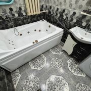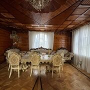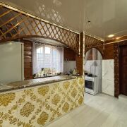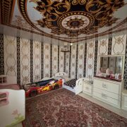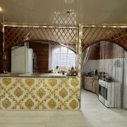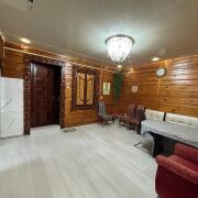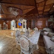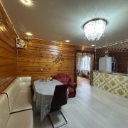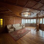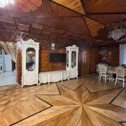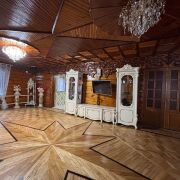 Интерьер дома наполнен натуральным деревом с элементами инкрустации на стенах, что создает атмосферу благородства и роскоши.