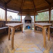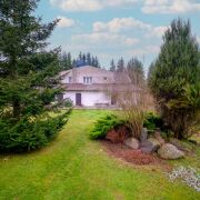 Дом расположен на краю деревни: если не знаешь – не увидишь, так ловко он прячется за деревьями. На обширном участке в 24 сотки выполнен ландшафтный дизайн. Нашлось место бане с камином и комнатой отдыха и беседке с мангалом