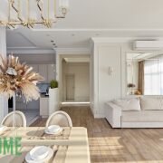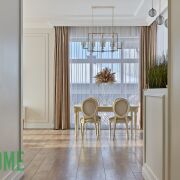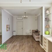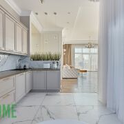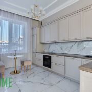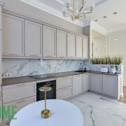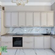 Кухня из массива ясеня со всей необходимой встроенной импортной техникой: посудомоечная машина, электрическая варочная панель, духовой шкаф, вытяжка, холодильник.