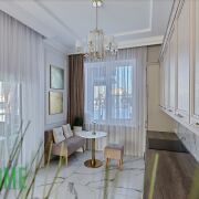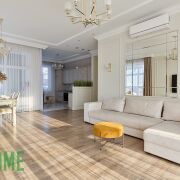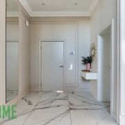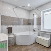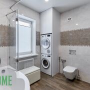 Стены – ячеистобетонный блок 400мм, утеплен, наружная отделка – декоративная штукатурка/камень; фундамент – свайно-ростверковый; крыша – металлочерепица; перекрытия – плиты перекрытия 220 мм; напольное покрытие – ламинат/плитка Tarkett, уложенные на стяжку с утеплителем.