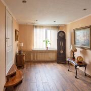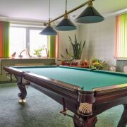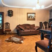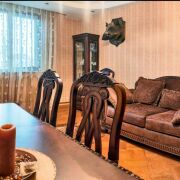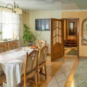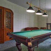 Дом разделен на 5 жилых комнат, кухню, 2 санузла, бильярдная (русский бильярд -комната отдыха в английском стиле), топочная, подсобные помещения и 2 гаража. Кухня площадью 25.6 м2 оснащена встроенным духовым шкафом и варочной панелью, вытяжкой, микроволновой печью, продумана эргономика пространства, выделена обеденная зона.