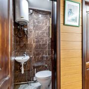 На первом этаже из 23.6м2 расположены: санузел, душевая комната с бойлером, кухонная зона с холодильником и стиральной машиной, жилая/спальная зона, места для хранения, мебель.