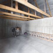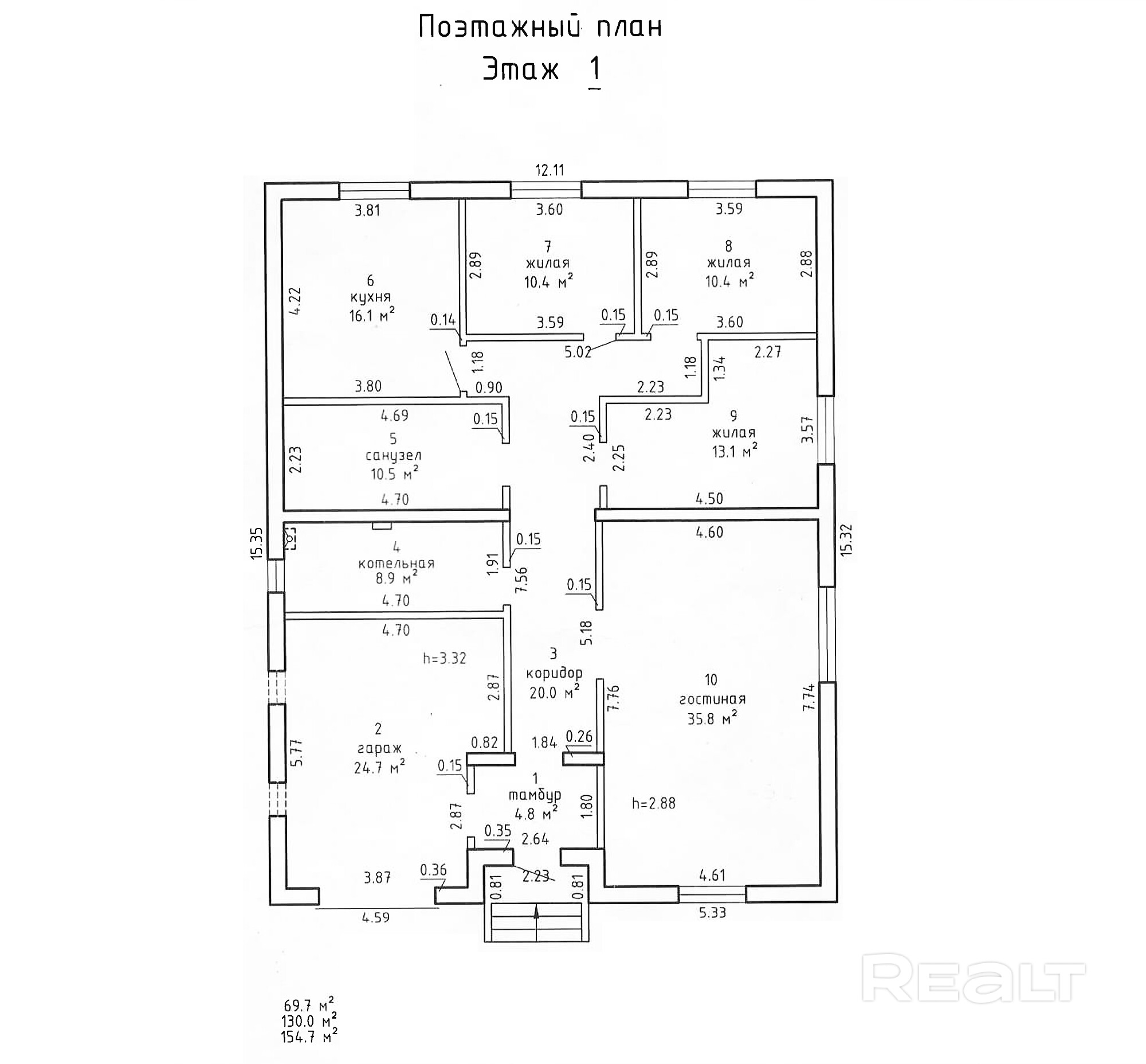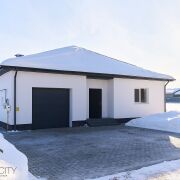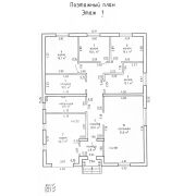 На первом этаже: просторная кухня (16,1 м2), большая гостиная (35,8 м2), три спальни (13,1 м2, 10,4 м2, 10,4 м2), большой санузел (10,5 м2), гараж (24,7 м2) с входом из дома.