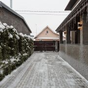Территория перед домом для заезда выложена тротуарной плиткой.