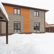 Стены - газосиликатный блок 40 см + 10 см мин.вата, снаружи отделка:  фасадный кирпич и лиственница.