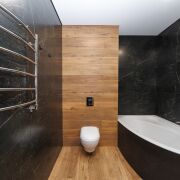 По всему первому этажу уложена система теплых водяных полов, плитка в декоре “под дерево”, лестница на металлокаркасе, ступени – натуральное дерево.