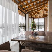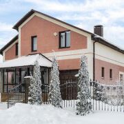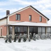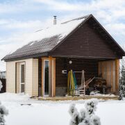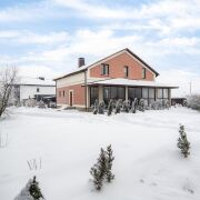 -Архитектура дома сдержанная и выразительная: аккуратный фасад, чёткие линии и большая остеклённая терраса, которая становится логичным продолжением жилого пространства. Терраса работает как полноценная зона отдыха -здесь одинаково приятно проводить летние вечера и уютные зимние выходные, наблюдая за участком и природой вокруг.