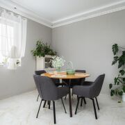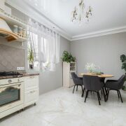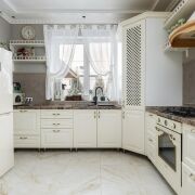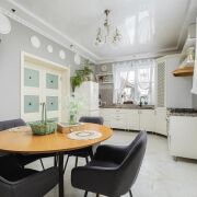 -Кухня оформлена в светлой, элегантной стилистике. Классический кухонный гарнитур с каменной столешницей, качественной фурнитурой и встроенной техникой выглядит стильно и актуально. Обеденная зона органично вписана в пространство, а за счёт окон и светлой отделки кухня всегда наполнена естественным светом. Это удобное и тёплое место для повседневной жизни и встреч с близкими.