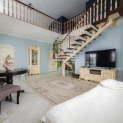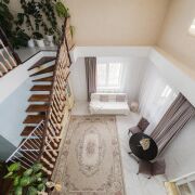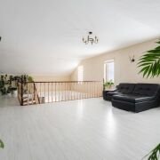 -Внутреннее пространство выстроено вокруг ощущения света и объёма. Просторная гостиная формирует центр дома: высокие потолки, открытая лестница на второй уровень и балюстрада создают воздушное, свободное пространство без ощущения перегруженности.
