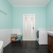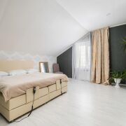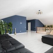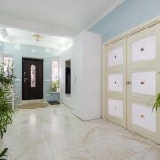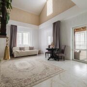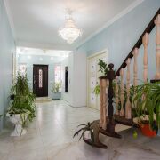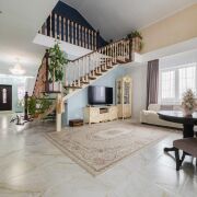 -Интерьер выдержан в спокойной, благородной палитре, с классическими формами и качественной мебелью, подчёркивающей статус дома. На полу - практичная плитка с мраморной фактурой, долговечная и уместная как с точки зрения эксплуатации, так и визуального восприятия, а также уложен качественный ламинат.
