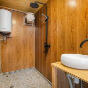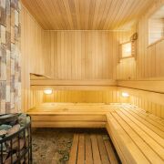 -Отдельного внимания заслуживает собственная сауна, выполненная с использованием натурального дерева и камня, она является полноценной зоной восстановления и отдыха.