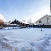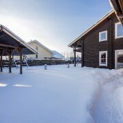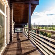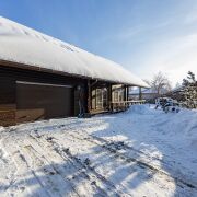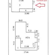 Гостевой дом включает в себя два этажа, на первом из которых расположена гостиная со встроенной кухней, санузел, гараж и сауна. На втором этаже расположены две комнаты со своими гардеробными. Санузел с душевой.