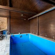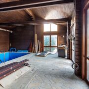 Основной дом включает просторную гостиную на первом этаже, с двухсторонним камином ручной работы из Франции, с гнутым стеклом. Есть отдельная комната для оборудования кабинета. Бассейн с панорамными окнами, водной пушкой, вентиляцией и осушением, отделан натуральным камнем и травертином. Санузел и топочная. На втором этаже расположено две спальни. Одна из которых мастер-спальня с гардеробной, просторным санузлом с джакузи.