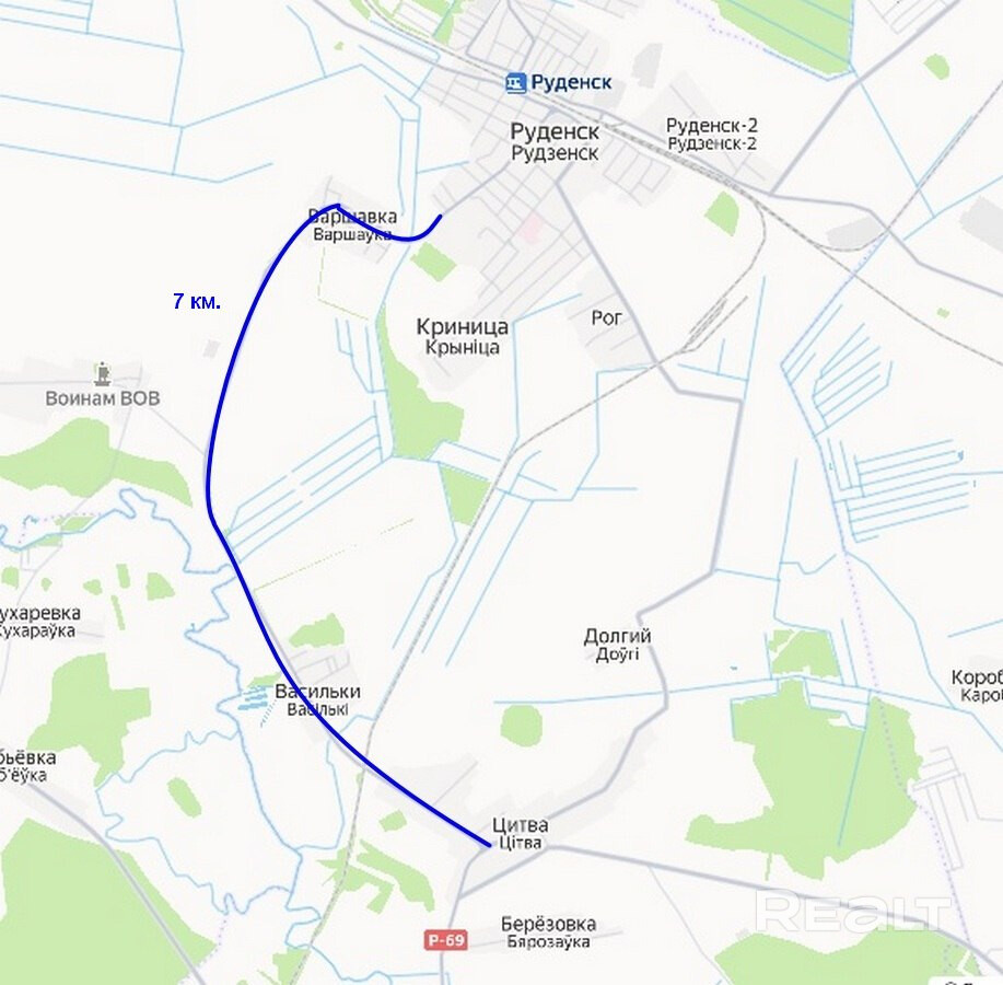 · Транспортная доступность: Участок обладает хорошими подъездными путями с твердым покрытием. Расстояние до МКАД (г. Минск) — 47 км, до г.п. Руденск — 7 км.