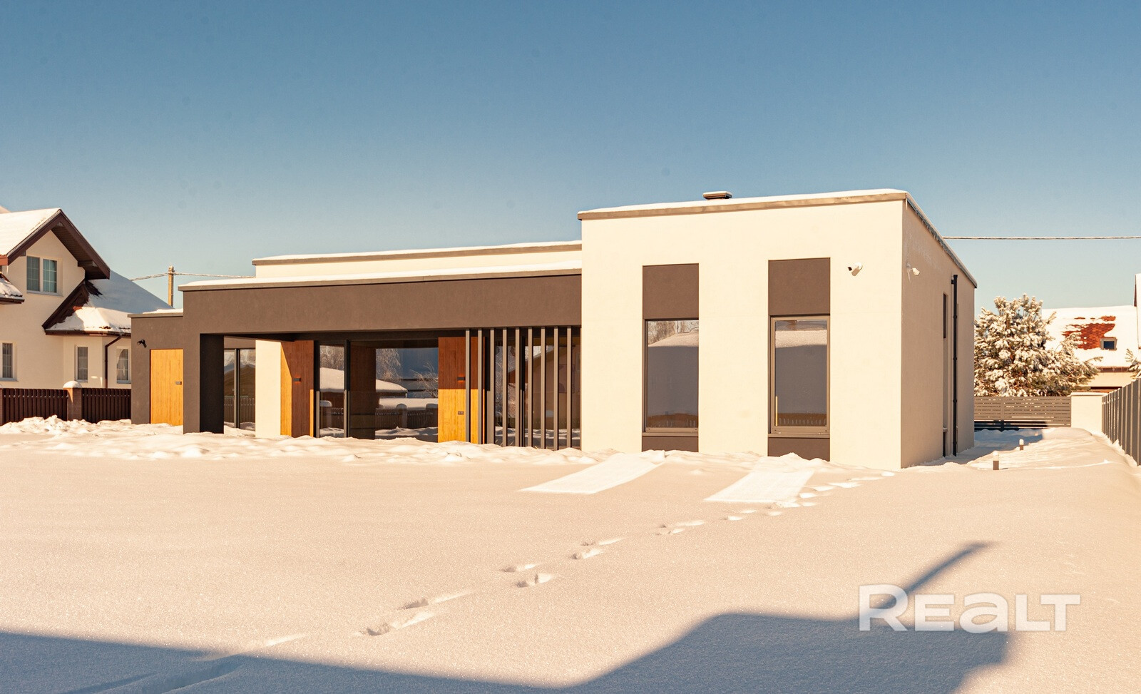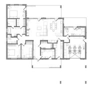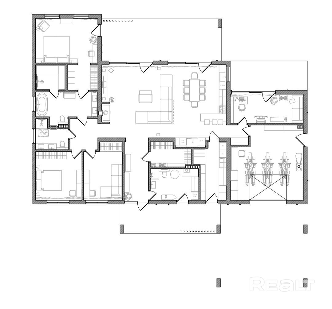 - Продуманное планировочное решение (3 спальни, 3 сан узла, 2 зоны кухни, 2 гардеробные, кабинет, хамам, 8 выходов на придомовую территорию, гараж, котельная), крытые террасы, навес для двух авто.