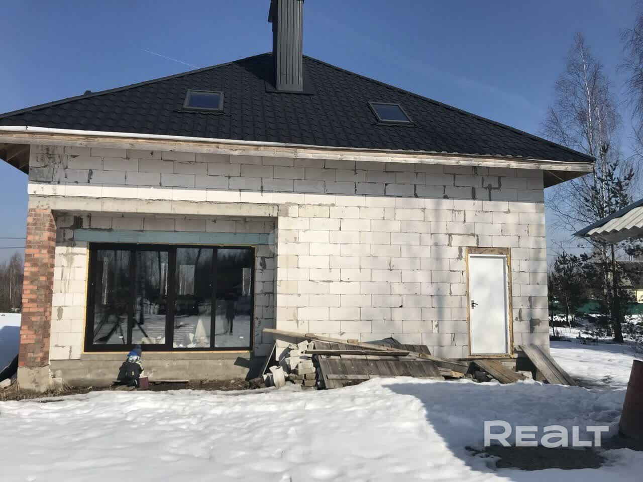 Дом из газосиликатных блоков, построен в 2015 году. Общая площадь здания 130 м2. Фундамент – ленточный, перекрытия деревянные, крыша – металлочерепица. На окнах ПВХ-профиль, полы залиты черновой стяжкой. Высокие потолки. Имеется дымоход для камина.