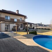 Установлен бассейн с подогревом, место для кострища, спортивная площадка с качелями, навес на два авто, открытая терраса для готовки;