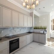 Кухня - гостиная (47,2 м2) с изысканной кухонной мебелью из массива ясеня со всей необходимой встроенной импортной техникой: посудомоечная машина, электрическая варочная панель на 4 конфорки, духовой шкаф, вытяжка, холодильник-морозилка);