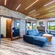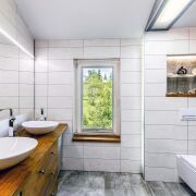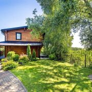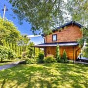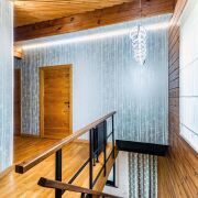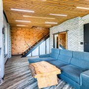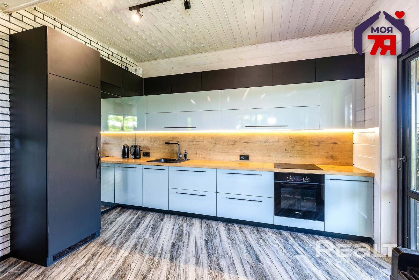 -В отделке использовано натуральное дерево и декоративный кирпич, которые создают атмосферу уюта. Просторная гостиная с панорамными окнами наполняется светом и открывает вид на зелёные пейзажи. Элегантная кухня со встроенной техникой и продуманной подсветкой, а также просторная ванная с видом на природу и качественной сантехникой подчеркивает высокий уровень комфорта этого дома.