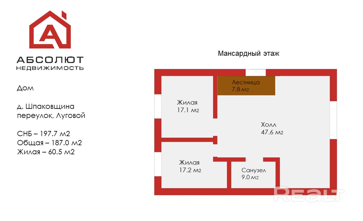 -общая площадь здания-197,7м2, общая площадь дома 187м2, жилая площадь дома -60,5м2;