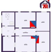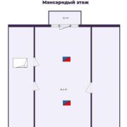 - Дом состоит из первого и мансардного этажей. На мансарде имеются два входа: один через металлическую лестницу снаружи и другой — по деревянной лестнице внутри. Оконные проёмы ПВХ обеспечивают свет и тепло.