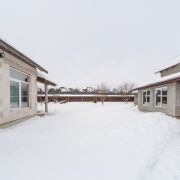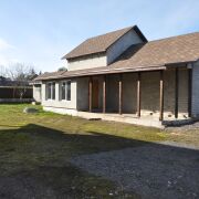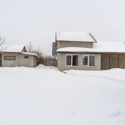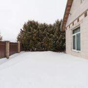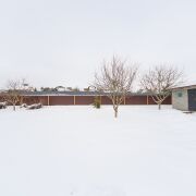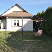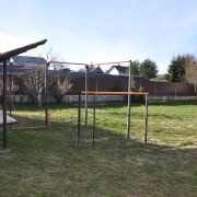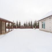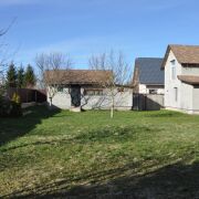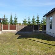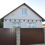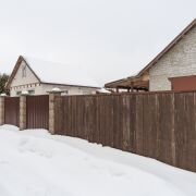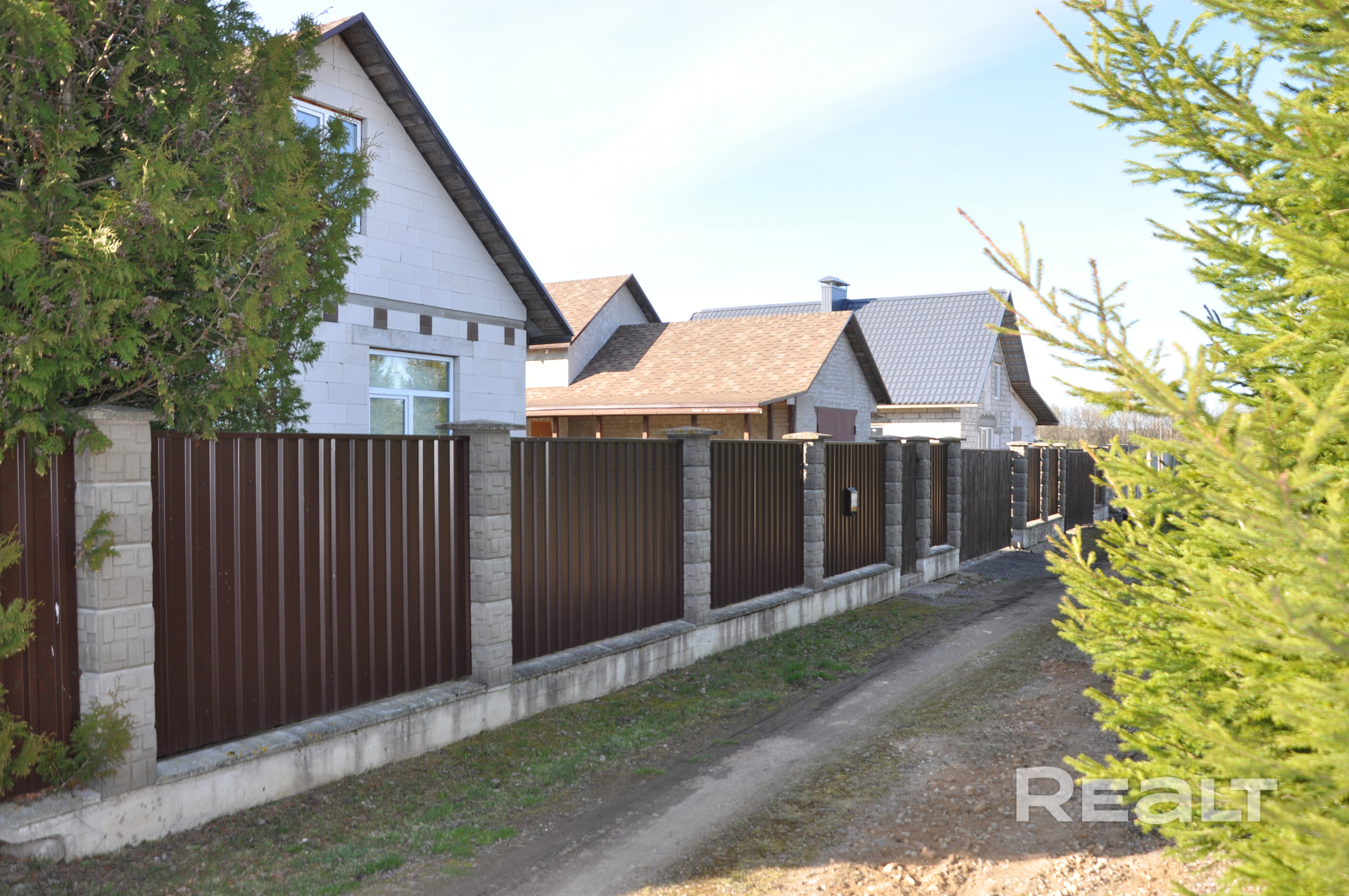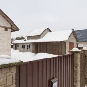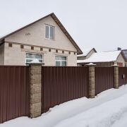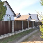 Огорожен со всех сторон металлопрофилем, установлены двое распашных ворот – для заезда в гараж и для заезда к жилому дому.
