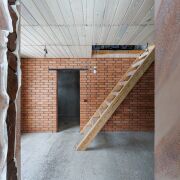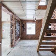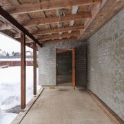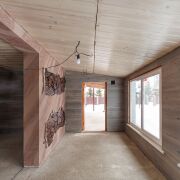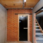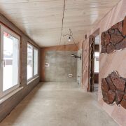 Во внутренней отделке гостевого домика использован натуральный камень песчанник, декоративная штукатурка, плитка.