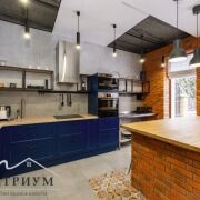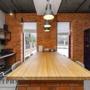 · 1-й этаж: Объединенное пространство кухни-гостиной 33.3 и 53.3 м2 соответственно, полностью укомплектовано всем необходимым. Интерьер в стиле лофт, с открытой кирпичной кладкой в сочетании с глубоким синим цветом фасадов кухни и обивки дивана на фоне молочных стен создает ощущения воздуха и свежести. Выход из гостинной на большую открытую террасу с видом на лес и собственный участок. Просторная гостиная с огромным диваном. Гостевой санузел, постирочная и техническое помещение.