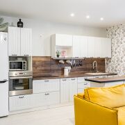 - на первом этаже дома: две жилые комнаты, просторная кухня со встроенной техникой, совмещенная с гостиной и выходом на террасу; раздельный санузел, оборудован душкабиной и ванной, биде – вся сантехника исправно работает, постирочная