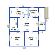 В доме 3 комнаты (8.5 м.кв., 7.9 м.кв. и 6 м.кв.) и кухня ( 12.2 м.кв.) .