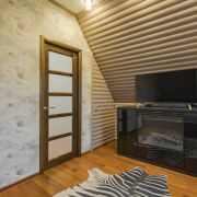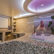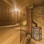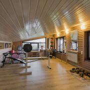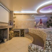 На первом этаже – сауна, душевая, просторная зона отдыха 49.6 м с джакузи и камином на дровах. Теплые полы.