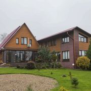Оцилиндрованный брус из Витебского заповедника, утеплен; крыша – металлочерепица; фундамент – бутобетон;